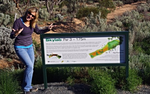 Although we constantly chased the sun through two time changes, we weren't able to make it to Norseman before we lost sunlight. But, we were very happy to spend the evening in little spot known as Balladonia. It was so peaceful. The motel was clean and dinner of chicken, potato, and broccoli, was delicious. And, it meant we could play the Skylab golf hole in the morning.