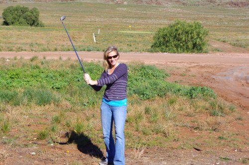 Time for more golf! Stopping at Mogas we picked up our clubs and balls for the Watering Hole hole. It is a par 4, 330 meter fairway. Hectie's first shot was a beauty. Mine was so so..a long roller. As we took a hike to find Hectie's ball, Hectie was sure he'd never see it again, but as we turned the corner we saw the white glow of it laying perfectly on the dirt. Hectie ended with 1 over par…very nice. Me, well a few bad putts put me further behind…5 over par. 😦