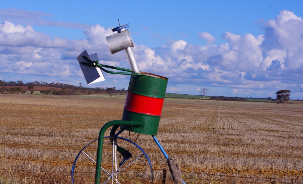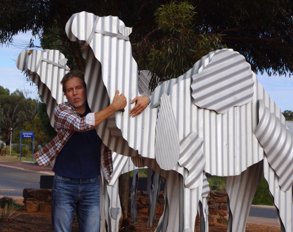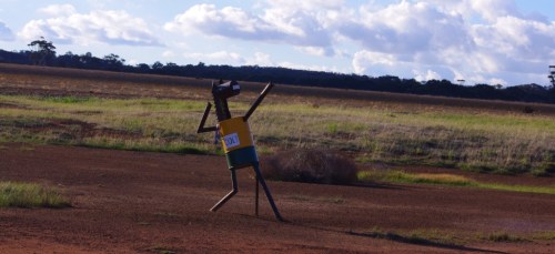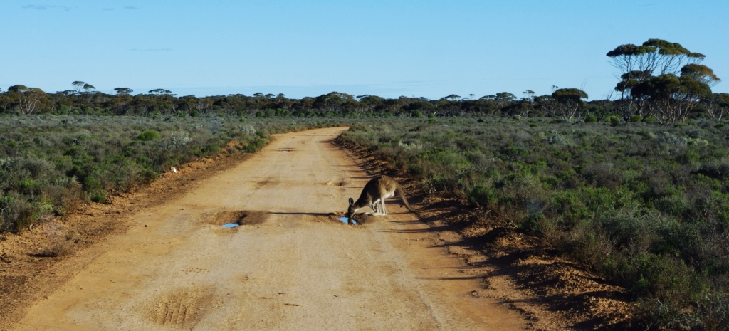 Heading towards the dark rain clouds, we drove the back road from Southern Cross (population 1,100) to Hyden to see the giant wave. A few skippies hopped across the road ahead of us and the rain poured down. The road got muddy and our VW ute went from a glossy black to an earth red, as we splashed through the puddles.