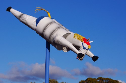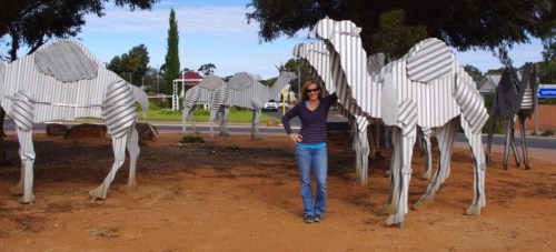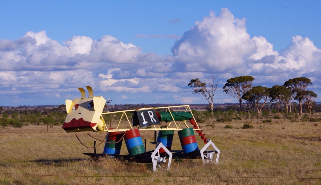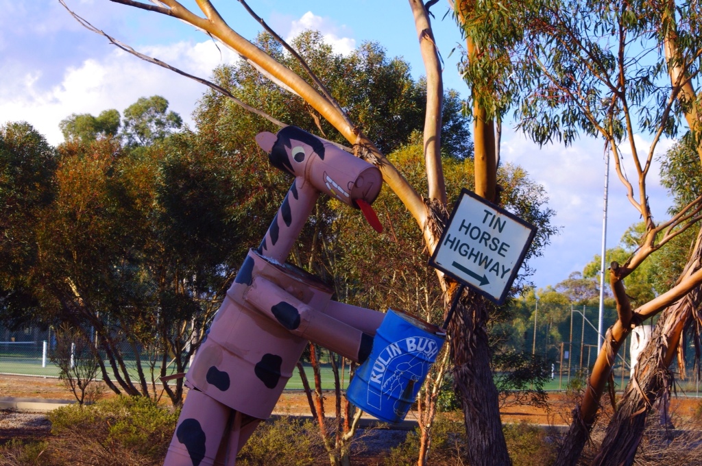 After our wave rock visit, we stopped at the local bakery. I picked up the visitor guide and discovered that between Hyden and our destination, Narrogin, there is a highway known as the Tin Horse Highway. It didn't take much convincing to get Hector to drive it. Hilarious! The local community of Kulin has a tin horse art competition each year to promote the Bush Race (which I think is a horse racing event) and designated this road to showcase the quirky horse art.