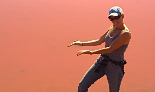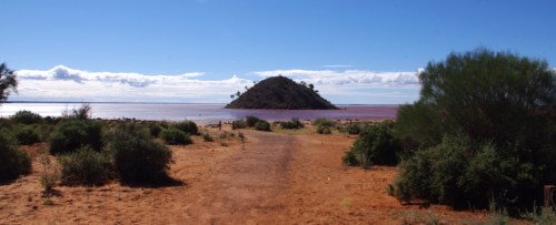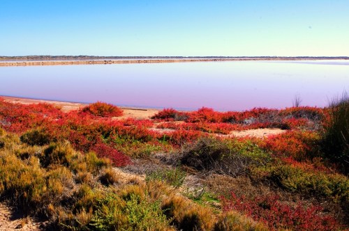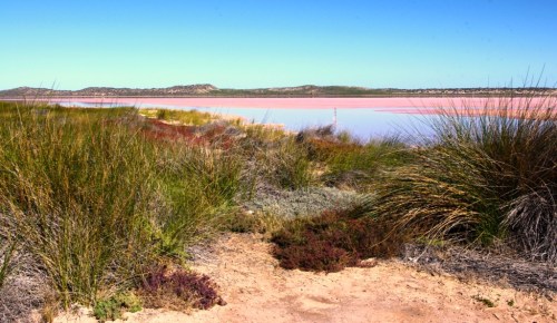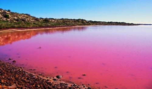This lake is known as Hutton Lagoon. It is the color of pink because of naturally occurring beta carotene or due to Dunaliella salina, a bacteria trapped in salt granules…not sure. Very intriguing site, especially if your favorite color is pink.