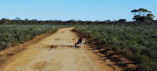 As I drove a few kilometers out of town, we saw a nice attraction sign for the Caiguna Blowhole. Turning off to go see it, we went head to head with a caravan on a narrow dirt road. Deciding I was the chicken I pulled off the road. The other driver stopped and told us the blowhole was no where to be found. Not believing him, we contined the search and…came up empty! Wtf…we drove for over an hour disturbing herds of kangaroo…to FIND NOTHING. We left after searching all possible routes and continued west.