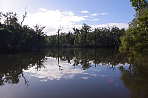 This morning the sun was determined, and it attempted to appear even though a light mist was raining down. Having slept in my running clothes last night, I was just as determined and very ready for the run this morning. The slight chill in the air would not keep Hector or me inside. We ran off from our little cabin at the Riverview Park and took a right down the dirt road to the Margaret River. Crossing the bridge we watched a smokey mist rise from river like floating ghosts.