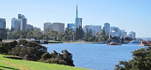 View of Perth along the Swan River. The tall green building is the Bell Tower at Barrack Square. The Bell Tower is an 82.5 meter tower which houses 12 bells (bells of St. Martins-in-the fields in Trafalgar Square)…interesting! http://www.thebelltower.com.au